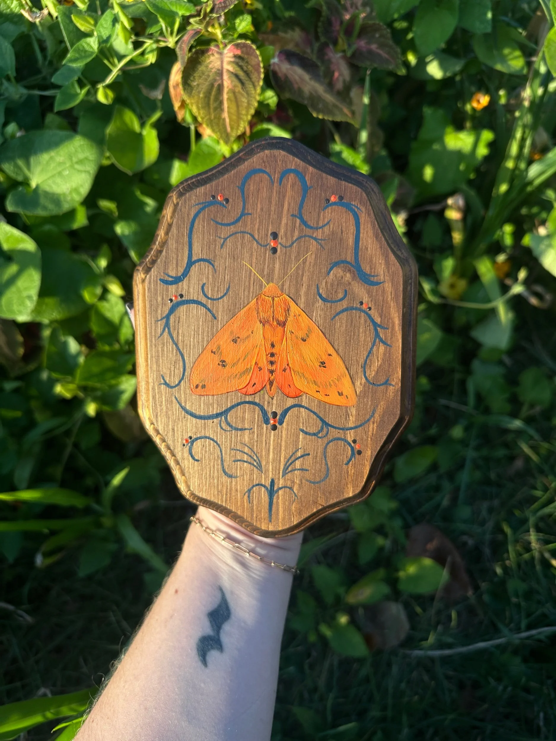 Isabella Tiger Moth original artwork, painted on wood plaque. Using acrylic paint, I hand painted the tiger moth then surrounded it with filigree, including dot patterns to resemble the Woolly Bear Caterpillar, the moth’s caterpillar form! The wood plaque is stained with a walnut brown, and the back of the plaque has a keyhole style hanger carved in the center for easy flush mount hanging. This is the original painting. Roughly 5”x7”